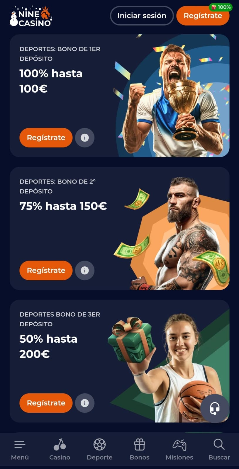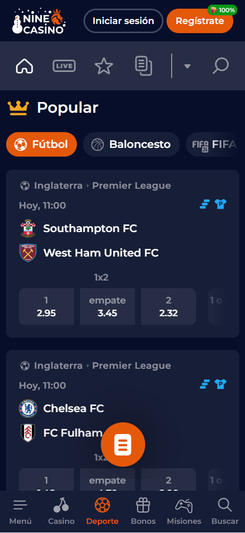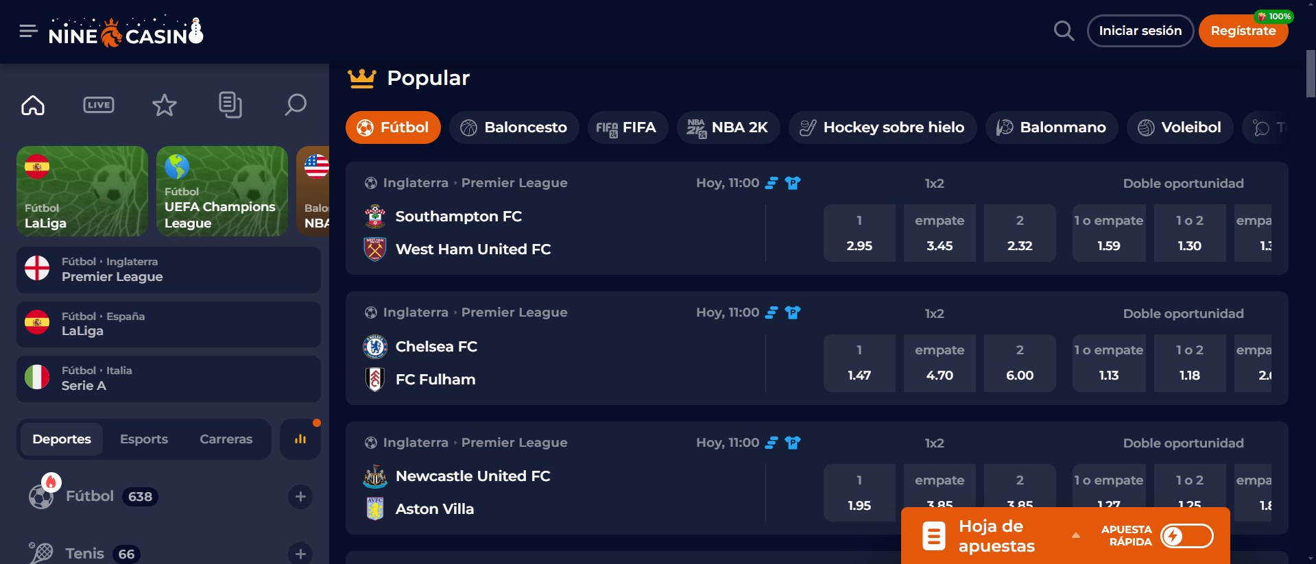 En la zona de deportes Nine Casino verás las opciones “Deportes en vivo” y “Resultados deportivos” en caso de que ya esté el partido en curso o que se te haya pasado el tiempo. Podrás apostar mientras tu esperado partido se desarrolle. Con esta herramienta lograrás hacer winspark mucho más precisas en Nine Casino, además consigues cuotas exclusivas y aumentadas para los apostadores que eligen apostar en juegos en vivo.