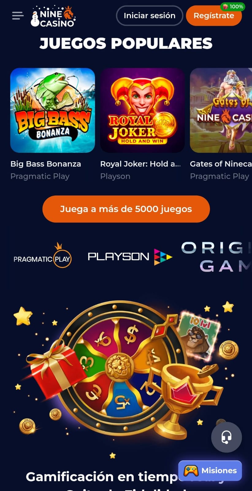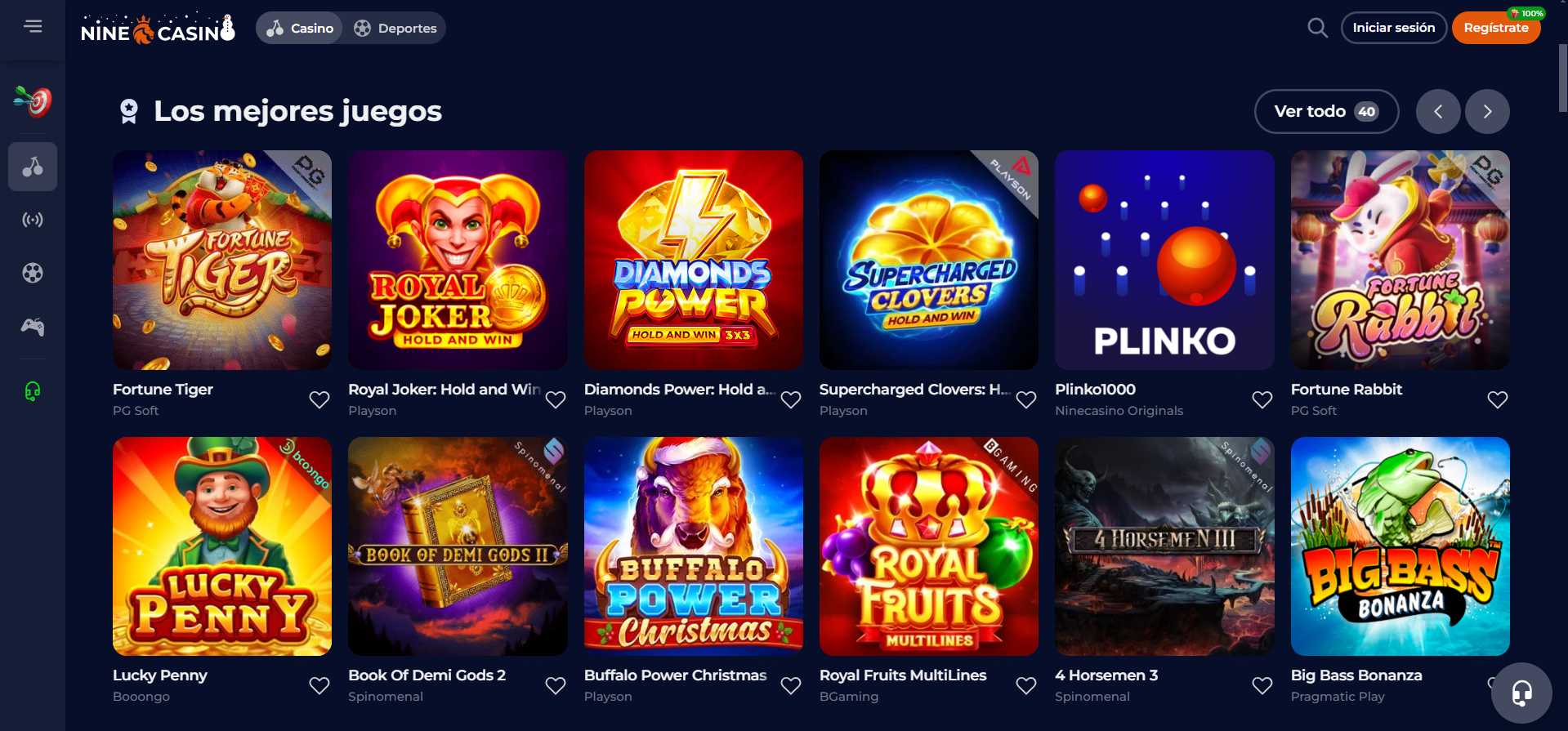 Nine Casino ofrece una amplia gama de más de 6000 emocionantes juegos de casino adaptados a las preferencias de cada jugador. Gracias a la gran variedad de opciones y diversas categorías de juegos de azar, tendrás una sección de tragamonedas de proveedores prestigiosos como Pragmatic Play, Spinomenal, Evolution, MGA, BGaming, Red Tiger y REDRAKE.